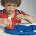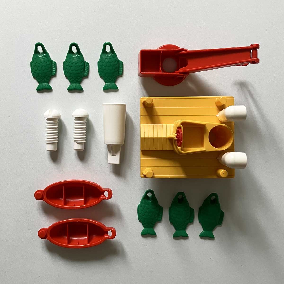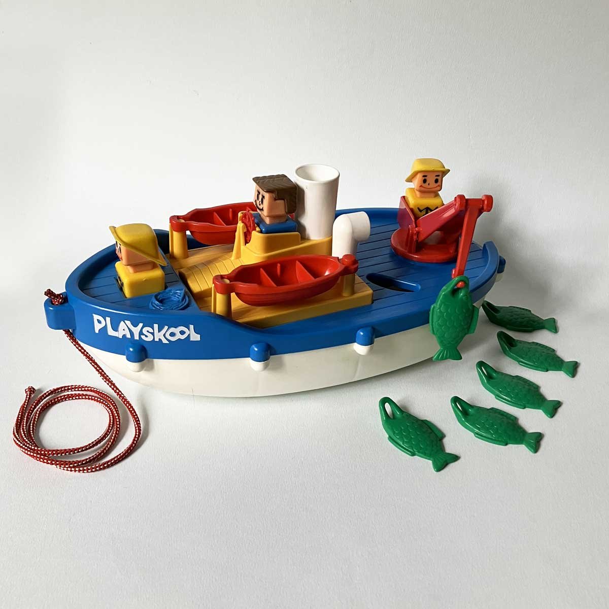 Bateau de pêche et jeu de construction de la marque Playskool, dans sa boîte. Il flotte, se démonte et le pêcheur grâce à son palan fait des pêches miraculeuses, qu'il pourra stocker dans la cale du bateau. Seconde main des années 70.